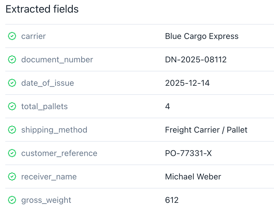 Verwandeln Sie jeden Lieferschein (PDF, Scan, E-Mail-Anhang) in sauberen, strukturierten JSON in wenigen Minuten. Erweitern oder passen Sie das Schema jederzeit an.