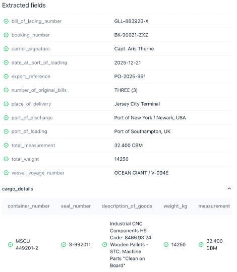 Turn any bill of lading (PDF, scan, or email attachment) into clean, structured JSON in minutes. Extend or adjust the schema anytime.