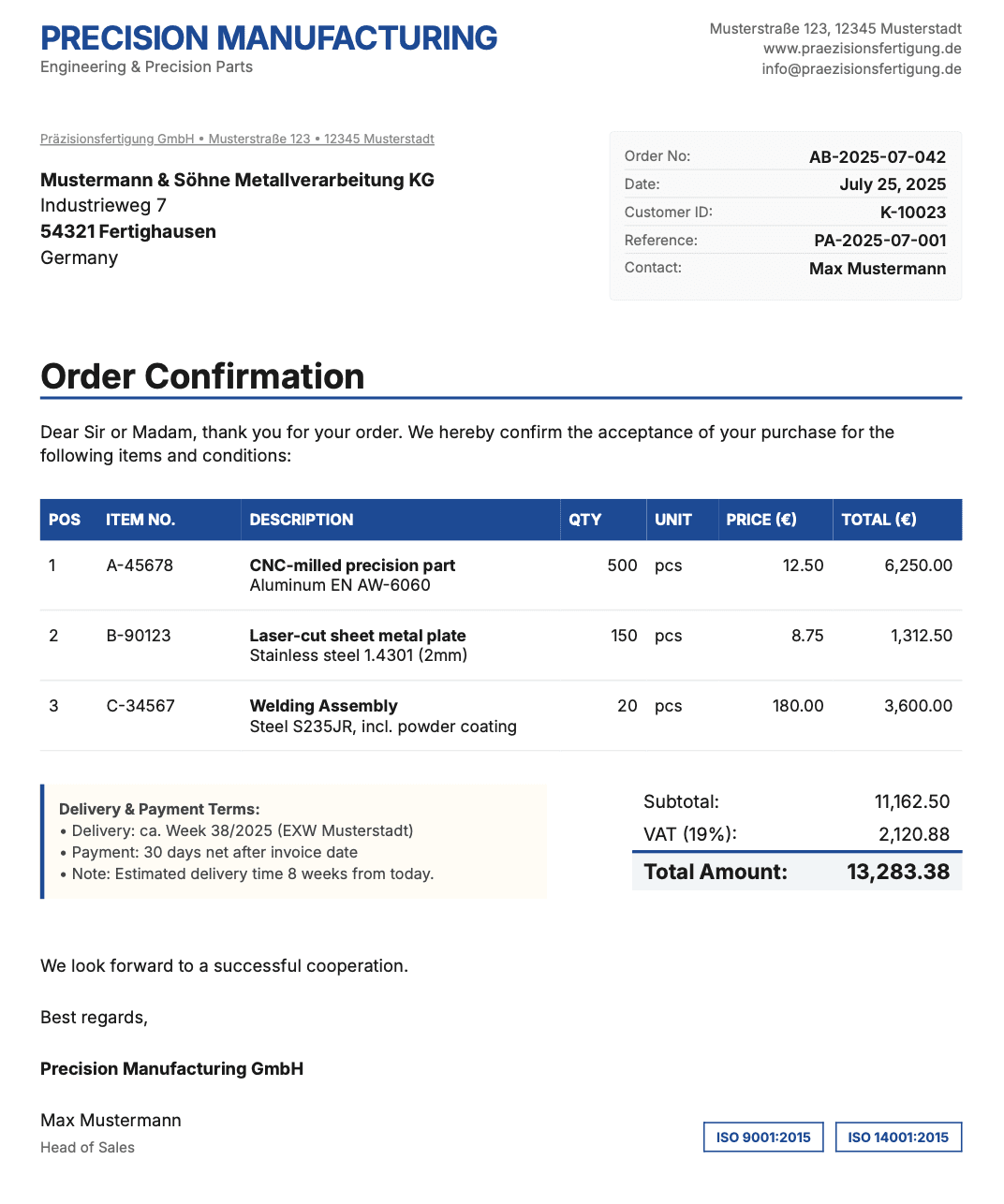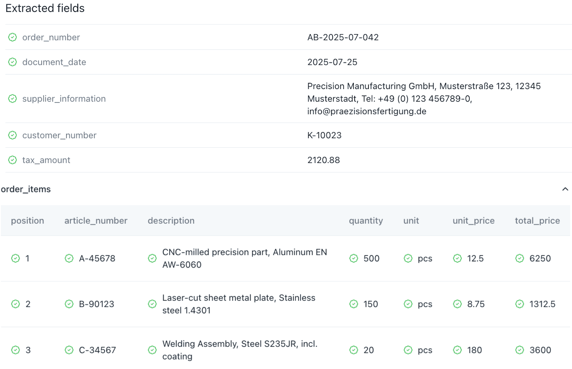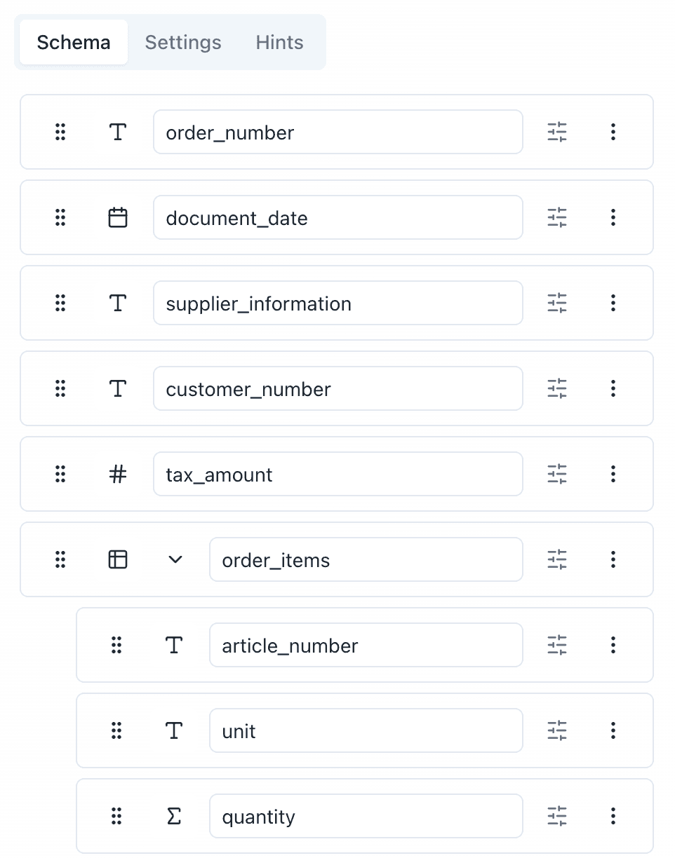 Turn any order confirmation (PDF, scan, or email attachment) into clean, structured JSON in minutes. Extend or adjust your schema anytime.