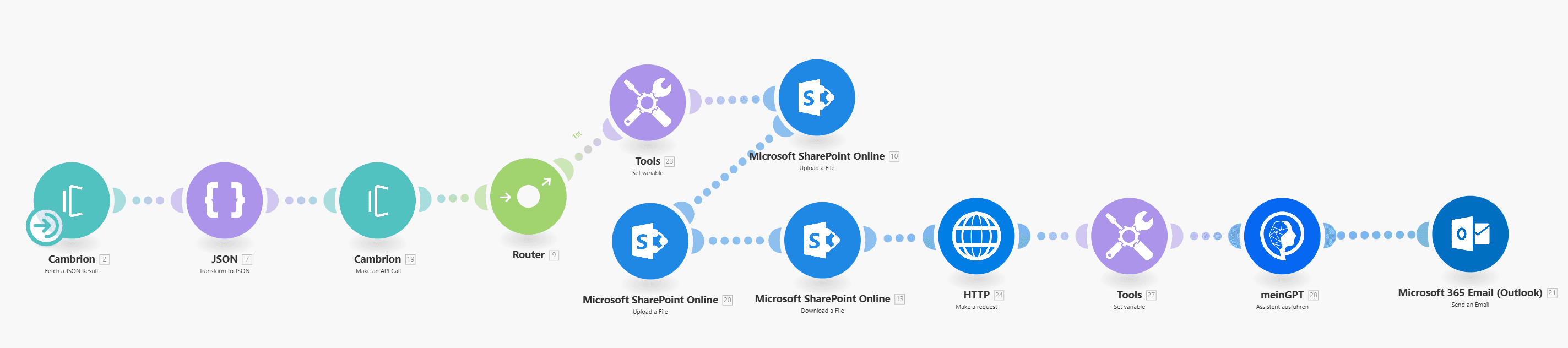 Ecosystem integration: Cambrion sends the structured JSON to a validation logic, which checks for errors, fully automated on Make.com (see below). Finally, meinGPT drafts a human-readable summary report, which is emailed to the Process Owner automatically.