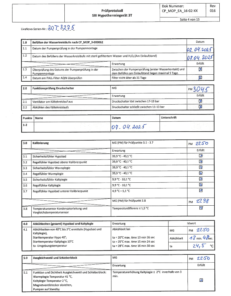 LAUDA is the world leader in precise temperature control. Their devices are used in critical environments where safety and accuracy are non-negotiable. Consequently, the final quality inspection involves rigorous documentation. Every machine comes with a detailed test protocol, typically 15 pages long, containing a mix of printed technical specs, handwritten measured values, technician signatures, and dozens of checkboxes verifying specific voltage configurations (e.g., US vs. EU standards).